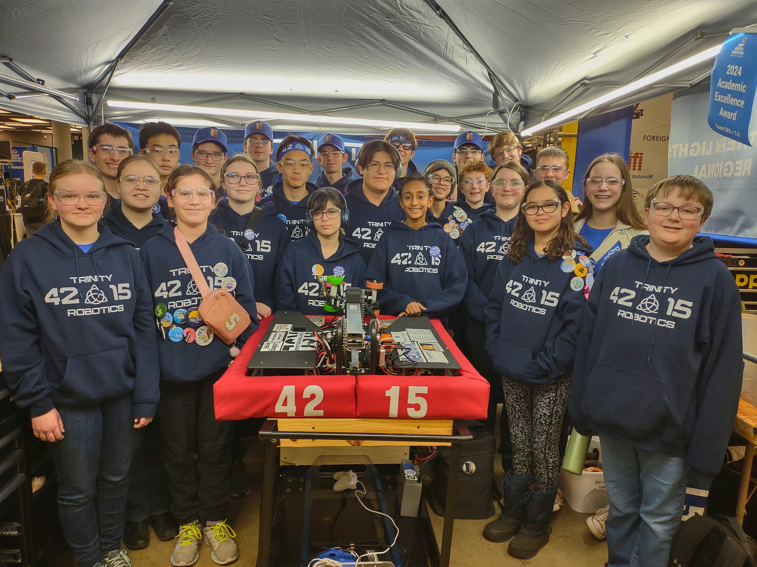 We are Robotics Team 4215 from Trinity School at River Ridge, also known as the Trinity TRIBOTS! Our team consists of students in 7th through 12th grade. We build and compete in local FIRST Robotics Competitions every year. We also encourage other students’ interest in robotics and STEM through educational workshops and other community events. Our team's mission is to foster creativity, teamwork, and fun while learning about engineering and design.